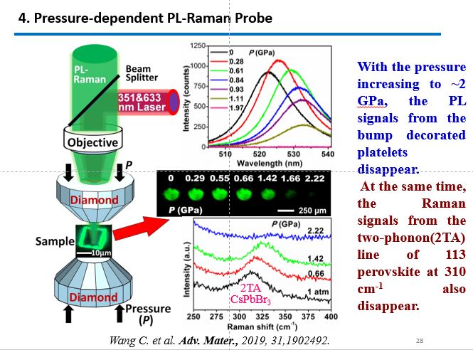 近年来,金属卤化物钙钛矿材料作为一种新型的半导体材料,集合了光学带隙可调、种类丰富、辐射发光效率高、有效原子序数大、价格低廉以及可低温溶液合成等众多优点,在X射线闪烁成像领域展现出巨大的应用潜力。然而,针对金属卤化物钙钛矿材料作为X射线闪烁体存在的一些问题,包括零维钙钛矿Cs4PbBr6,二维钙钛矿CsPb2Br5和Ruddlesden-Popper钙钛矿发光机制不清晰的问题,利用同一微区的显微荧光-拉曼技术解决了因为XRD的高检测限而无法检测铅卤钙钛矿中的微量CsPbBr3(MAPbBr3)纳米晶的问题,揭示了铅卤钙钛矿强烈光致荧光发光的起源为掺杂的极微量CsPbBr3(MAPbBr3)纳米晶。利用动态静水压下的高压/荧光研究方法,进一步排除了Br-空位缺陷作为铅卤钙钛矿发光起源的可能性。