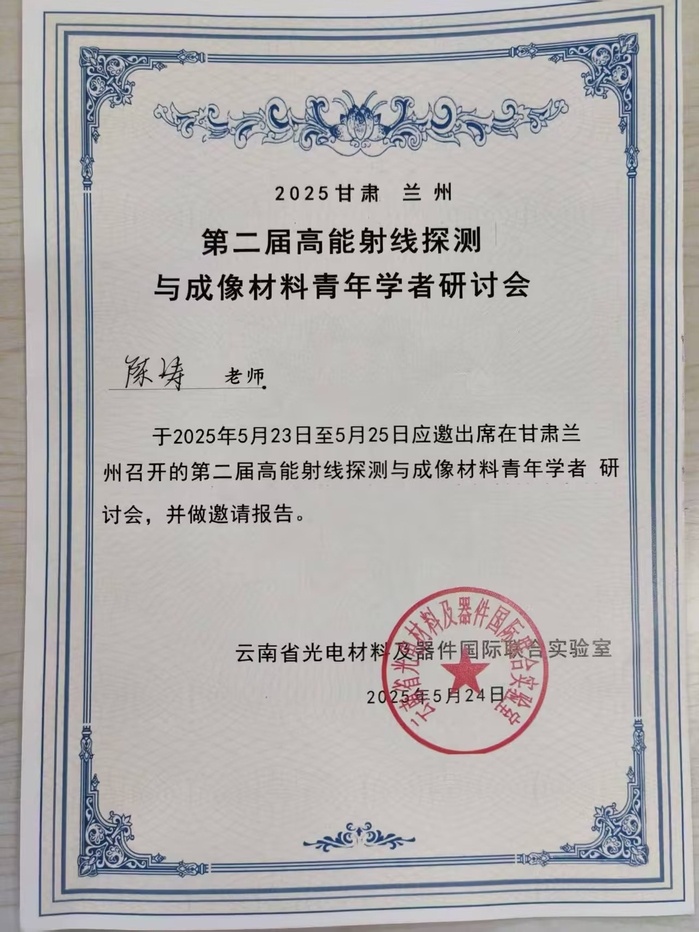 2025年5月23-5月25日,第二届高能射线探测与成像材料青年学者研讨会在兰州长城国际饭店举行。我院绿色化工新材料黄山市技术创新中心的陈涛博士受邀作题为“Photoluminescence-Raman/FTIR under Variable Hydrostatic Pressure to Reveal the Origin of Luminescent Centers in Lead Halide Perovskites”的学术交流报告。