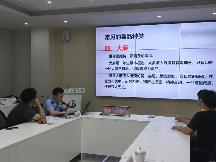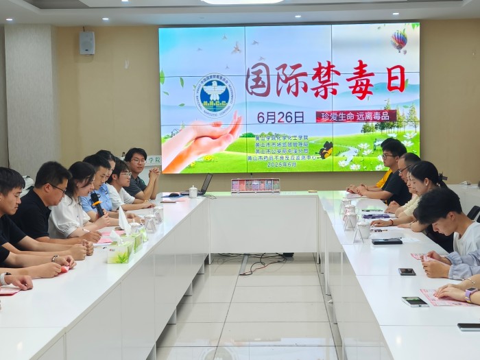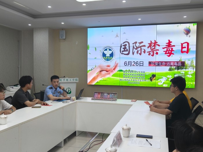 6 月 16 日下午,化学化工学院联合黄山市市场监督管理局、黄山市屯溪公安分局以及黄山市药品不良反应监测中心,在逸夫综合楼 5316 会议室举办“6.26 国际禁毒日” 科普进校宣传活动,活动吸引了学院众多师生。本次活动以“健康人生,绿色无毒” 为主题,旨在向化学化工学院学生普及毒品及药物滥用的相关知识,提升大学生的辨别和防范能力,营造无毒校园环境。