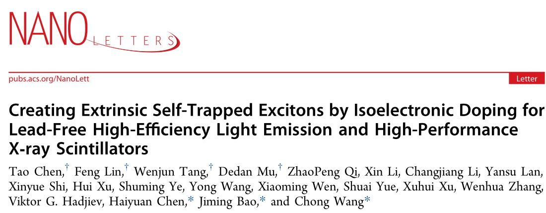 近日,化学化工学院青年教师陈涛联合休斯顿大学、电子科技大学、昆明理工大学等多家科研单位合作,在金属卤化物闪烁体研究方向取得进展,相关成果以题为“Creating Extrinsic Self-Trapped Excitons by Isoelectronic Doping for Lead-Free High-Efficiency Light Emission and High-Performance X-ray Scintillators” 发表在纳米科学领域的权威知名期刊Nano Letters (Nature Index期刊,影响因子:9.058)上。