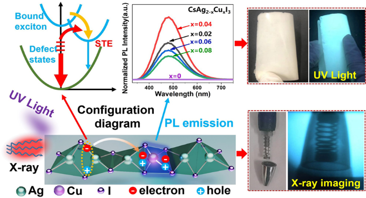本研究基于等电子掺杂策略,通过向[AgI4]3-四面体链状一维CsAg2I3材料中引入Cu+离子,成功制备出非本征自陷态激子发光的闪烁晶体材料。实施等电子掺杂后得到的CsAg2−xCuxI3,其光致发光(PL)光谱与纯相CsAg2I3和CsCu2I3均存在显著差异,从而证实了CsAg2−xCuxI3非本征自陷态激子发光的特性,这种自陷态激子发光被认为是Cu+掺杂后电子-声子强烈耦合作用下的晶格振动所导致的,并且其发光起源通过密度泛函理论(DFT)计算进一步得到验证。Cu+掺杂的CsAg2−xCuxI3在室温下展现出接近100%量子效率的明亮自陷态激子发光发射,并具有高达92000光子/MeV的稳态X射线至蓝光的转换效率,展示了在X射线成像领域的应用潜力。