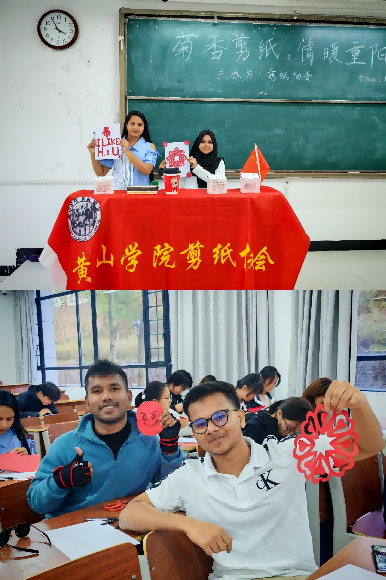 活动中,留学生们与参与的同学们,相互交流、合作创作。现场不时传来阵阵笑声,不同语言的交流声与剪刀裁剪红纸的“沙沙”声交织在一起,成为校园里最温馨的秋日旋律。剪纸是中华优秀传统文化的缩影,而重阳节承载着中国人对长辈的尊敬、对美好生活的向往。此次邀请留学生参与,不仅是为了让他们近距离感受中国传统节日与非遗文化的魅力,更是以文化为桥,促进中外学生的交流与理解。未来,剪纸协会还将结合元宵、端午等传统节日,开展更多文化体验活动,让非遗手艺在校园里焕发新活力,让中外学子在文化互动中收获友谊与成长。