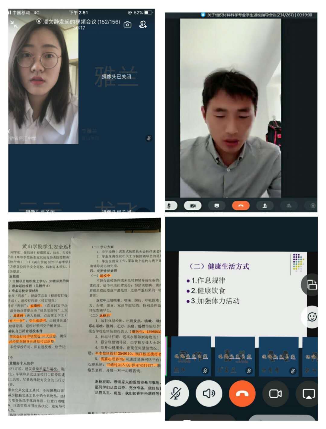 为保证每位同学都能准时观看学习,化学化工学院辅导员蔡开兵,李佳佳,潘文静,钱亚婷对此次活动十分重视,并号召各级班委在班级群内做好相应的通知。化学化工学院全体学生都准时收看了本次视频直播课,辅导员们有条不紊的讲述了返校必备的“两表”、“两码”、“一书”,并阐述了学校规划私人交通工具和公共交通工具返校的入校流程,着重强调生活方面安全问题,要求学生做好每日的晨午晚检,说明学习方面的安排进行问题,解决了学生的学习困难,并将突发情况分为返校中和返校后处理,线上学习之后辅导员们让同学们自由提问和发言,同学们的反响很大,非常积极。在本次会议中,化学化工学院全体学生认真听讲且做了笔记记录,并承诺会按照本次会议所规定的要求有秩序的返校。