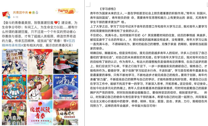 本次主题教育系列活动将五四精神与战“疫”专题紧密结合,带领团员青年重温五四精神,切实增强爱国、爱党情怀,引领广大青年学子勇做走在时代前列的奋进者、开拓者、奉献者。