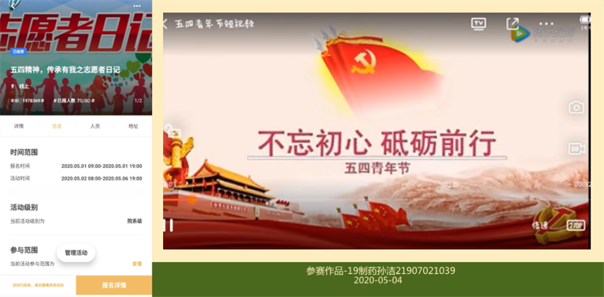 5月4日,化学化工学院开展了志愿者日记活动。参与者通过短视频,微纪录片,或者vlog的形式记录志愿者抗疫服务的身影。同学们热心服务社区,用实际行动弘扬五四精神,绽放战疫青春。通过此次录制志愿者服务视频活动,让同学们能够在防控疫情期间,再次感悟志愿服务精神,回归志愿服务初心。