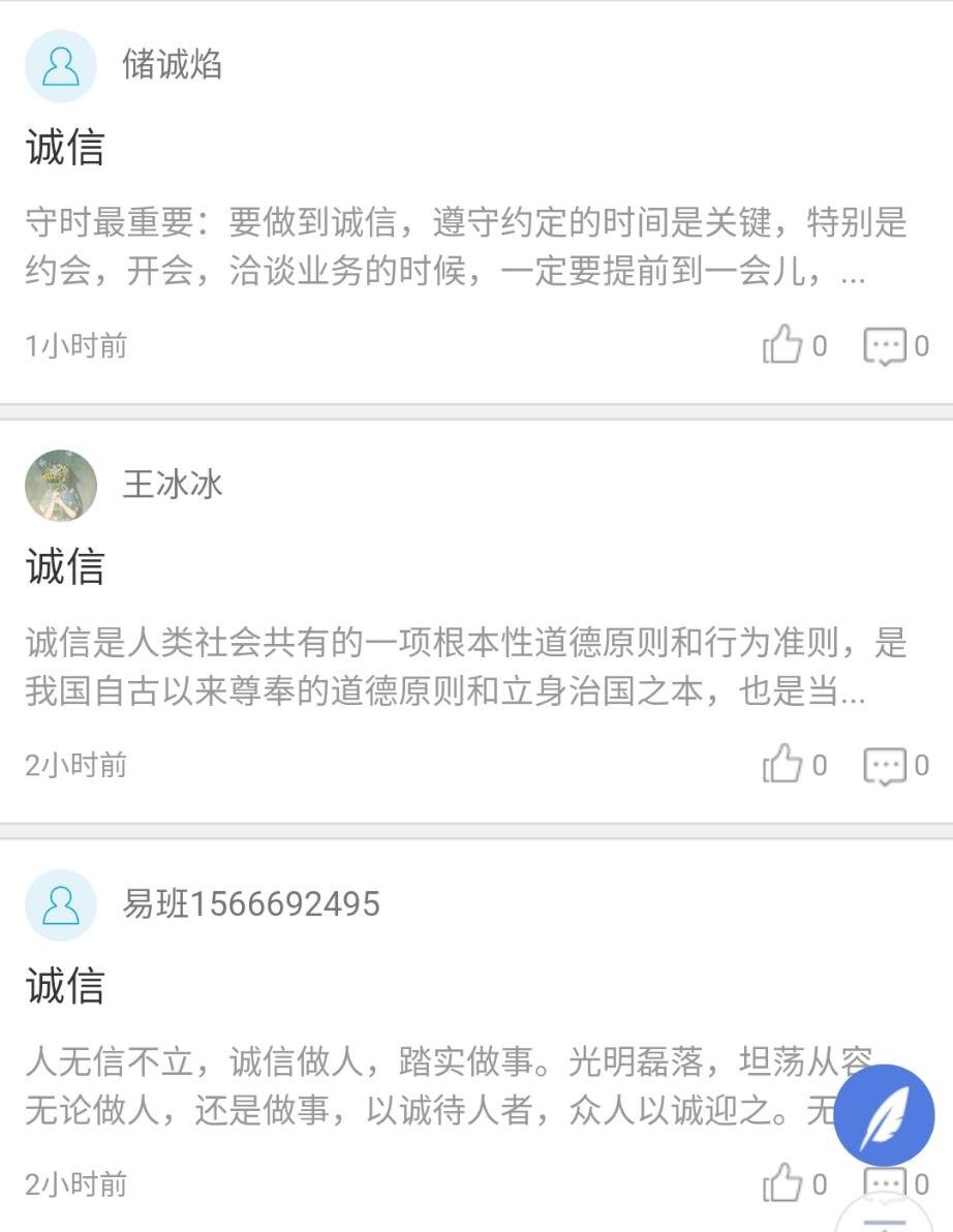 为保证每位同学都能准时参加此次线上主题活动,辅导员号召各级班委在班级群内做好相应的通知。此次班会材料班的每位同学都在易班群里发布了自己对如何增强诚信意识如何做到诚信的深刻认识。每位材料人的表情里都透露了对此次活动的重视,并承诺疫情在家会增强诚信意识,以诚待人,以诚做事。