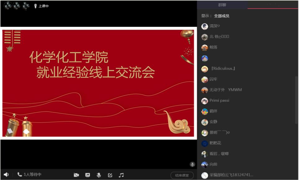 为了更好的帮助学生了解当前就业形势、转变就业观念、调整就业心态,6月3日晚上,化学化工学院举办了线上就业经验交流会。交流会邀请到了两位优秀毕业生,分享他们求职过程中的心得体会和宝贵经验,16,17级部分同学参加了此次活动。