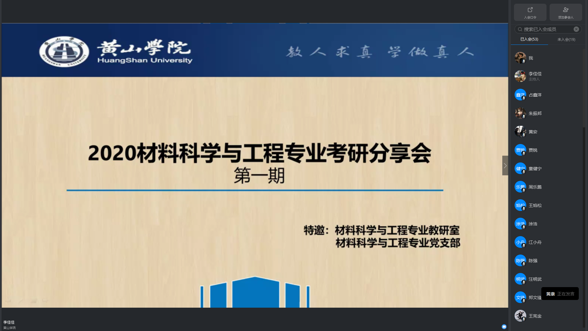 本次活动通过钉钉视频会议进行面对面经验交流,首先老师们从专业的角度分析了未来就业趋势,结合疫情带来的就业压力以及本专业的特点进一步阐述该专业考研的必要性。随后6名优秀考研学生代表分别从自身考研经历出发,从备考前到上岸后的历程通过故事的形式分享给学弟学妹;其中每位学生的分享反复说到一个词:“坚持”。会上,辅导员李佳佳对2020届材料科学与工程专业学生给予充分肯定,并特别感谢章鏴老师对16级、17级学生的倾情付出,最后强调在考研的路上一定要先确定好方向,有了方向速度才有意义。