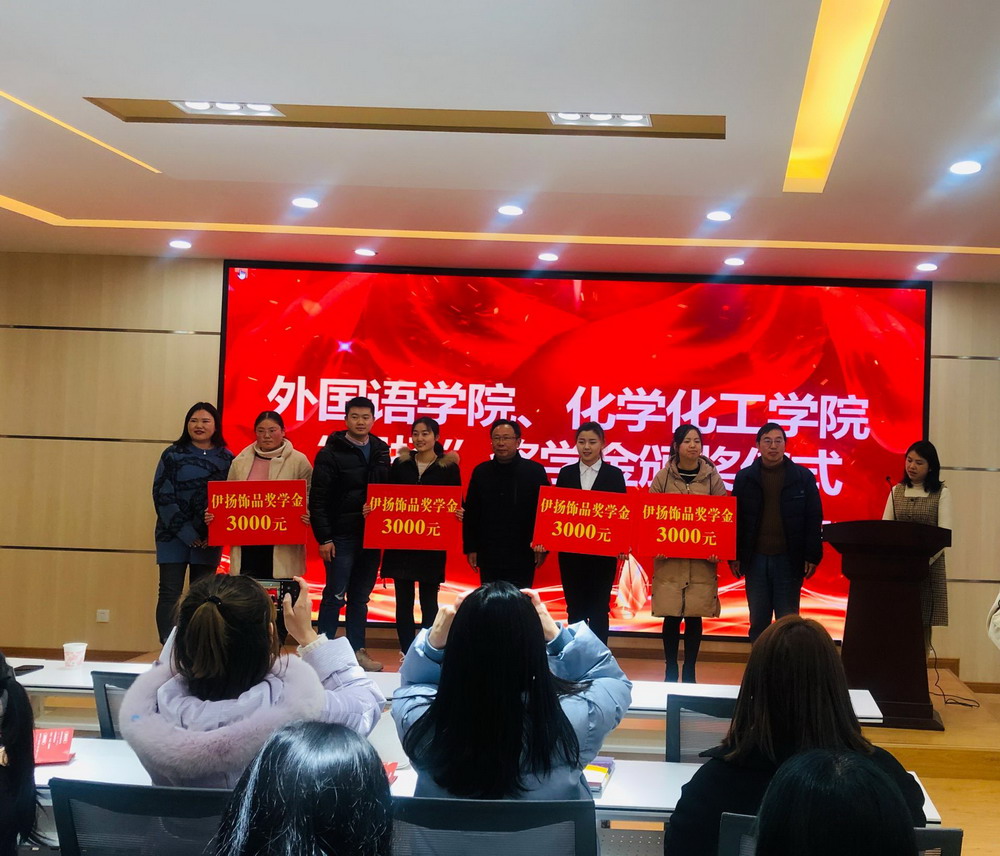 12月30日下午,化学化工学院联合外国语学院在5306教室成功举办首届“伊扬奖学金”颁奖仪式。伊扬饰品有限公司总经理刘杨、王草地、化学化工学院与外国语学院党政领导班子出席颁奖仪式。