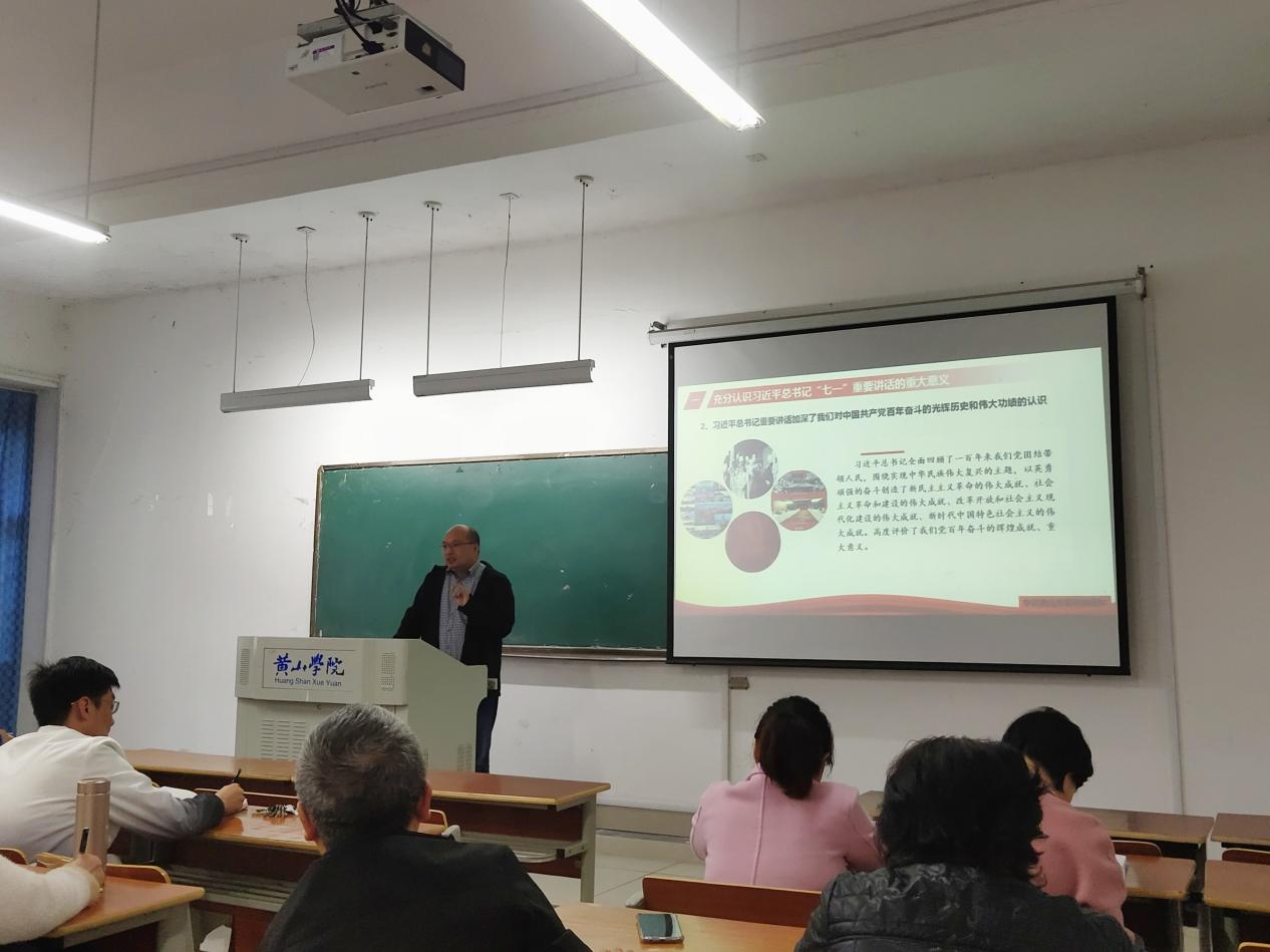 为扎实推动党史学习教育深入开展,化学化工学院于11月3日下午在逸夫综合楼5106教室举办学习贯彻习近平总书记在庆祝中国共产党成立100周年大会上的重要讲话精神专题宣讲会,马克思主义学院刘芳正教授应邀作专题宣讲报告,宣讲会由化学化工学院党委副书记叶双峰主持,学院全体教师和学生党员参加报告会。