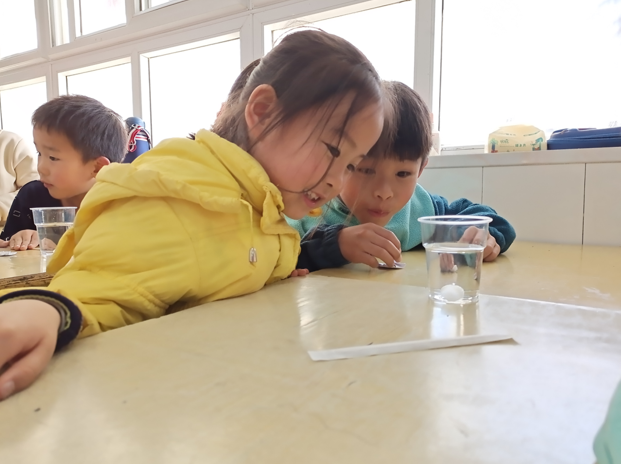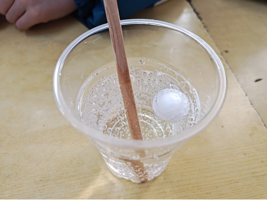 本期活动中,志愿者为小朋友们带来“樟脑丸在水中沉浮”的小实验。志愿者们首先将樟脑丸放入醋中,樟脑丸下沉到水底;再加入小苏打,只见樟脑丸迅速浮了起来,随后下沉又上浮,如此反复。志愿者在展示实验的同时向小朋友们讲述了实验的原理,小苏打与醋反应产生二氧化碳,二氧化碳气泡停在樟脑丸上,会把樟脑丸带上来, 当气体跑到空气后,樟脑丸又会下沉。演示结束,志愿者带领小朋友们一起动手完成实验,小朋友们积极参与,课堂氛围十分活跃。