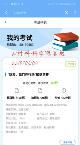 为引导我院学生掌握疫情防控基本知识,形成正确的预防观念,化学化工学院在线上开展了“防疫,我们在行动”防疫知识竞赛活动。本次活动依托易班优客平台开展,共计200余名同学参与了线上答题,题目内容主要包括疫情防控相关知识和健康卫生常识等方面。通过此次活动进一步普及了相关疫情防护知识,提高了应对疫情的能力,增强了自我防护意识,做到科学防控,共同战“疫”。