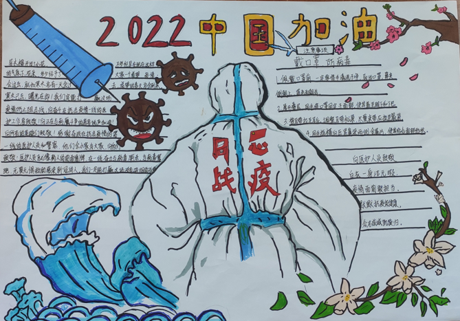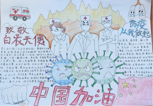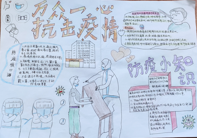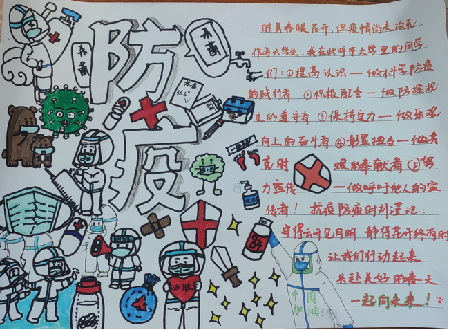 为进一步加强防疫宣传力度,增强广大同学的防护意识和责任意识,学院团委组织开展了“用心抗疫,携手凯旋”手抄报设计活动。参赛同学紧紧围绕疫情防控主题,采用多种途径查阅、收集防疫有关资料,精心选材并巧妙构思,一幅幅作品设计新颖,图文并茂,内容丰富,精彩纷呈。有的介绍了此次病毒的特点与传播途径,有的讲述了如何做好自我保护,一笔一画均表达了对医务工作者的敬意和对战胜疫情的信心。