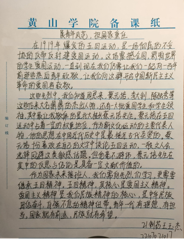 礼赞青春,风华正茂——五四主题征文活动。为隆重纪念五四青年节,充分展现新时期五四精神的时代内涵和当代青年的时代风貌,我院团委开展了“礼赞青春,风华正茂”五四主题征文活动。征文以五四青年节为背景,以歌颂党的丰功伟绩,以爱党、爱国、敬业、乐业为主要内容,主题鲜明,立意新颖,内容积极向上,思想性教育性强,能够充分展现当代大学生的良好精神风貌。征文比赛中同学们积极参与,踊跃来稿,用手中的笔记录了对祖国的热爱。