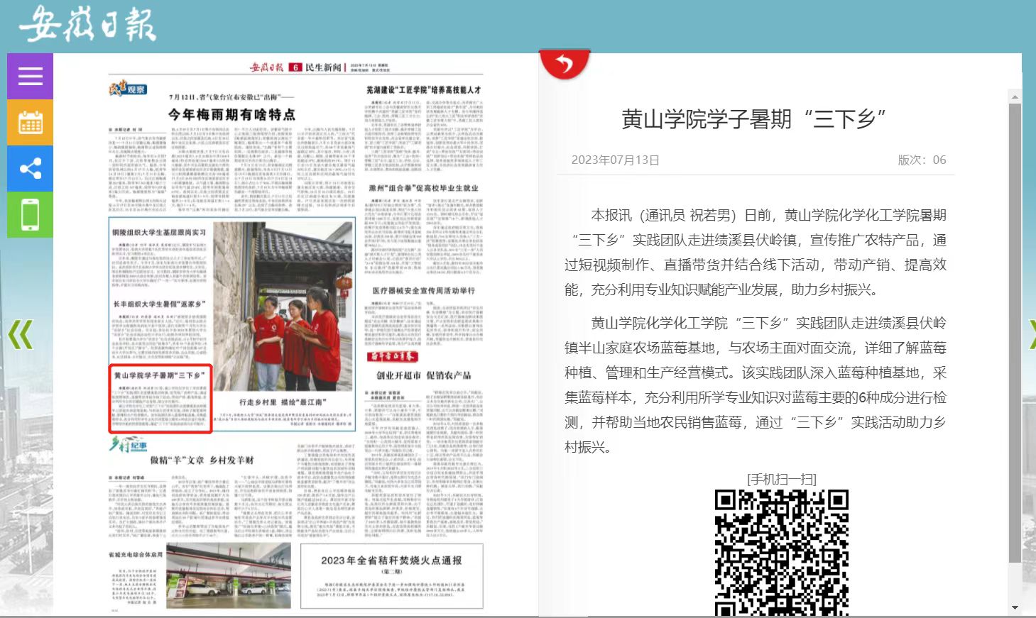 绩溪县半山家庭农场是伏岭镇蓝莓生产大户,为政府扶持的乡村振兴产业。化学化工学院“三下乡”实践团队走进当地蓝莓基地,与相关负责人面对面交流,详细了解了蓝莓的种植、管理、和生产经营模式。深入蓝莓种植地,采集蓝莓样本,充分利用所学专业知识对蓝莓主要的6种成分进行检测,并帮助当地农民销售蓝莓,通过“三下乡”实践活动助力乡村振兴。