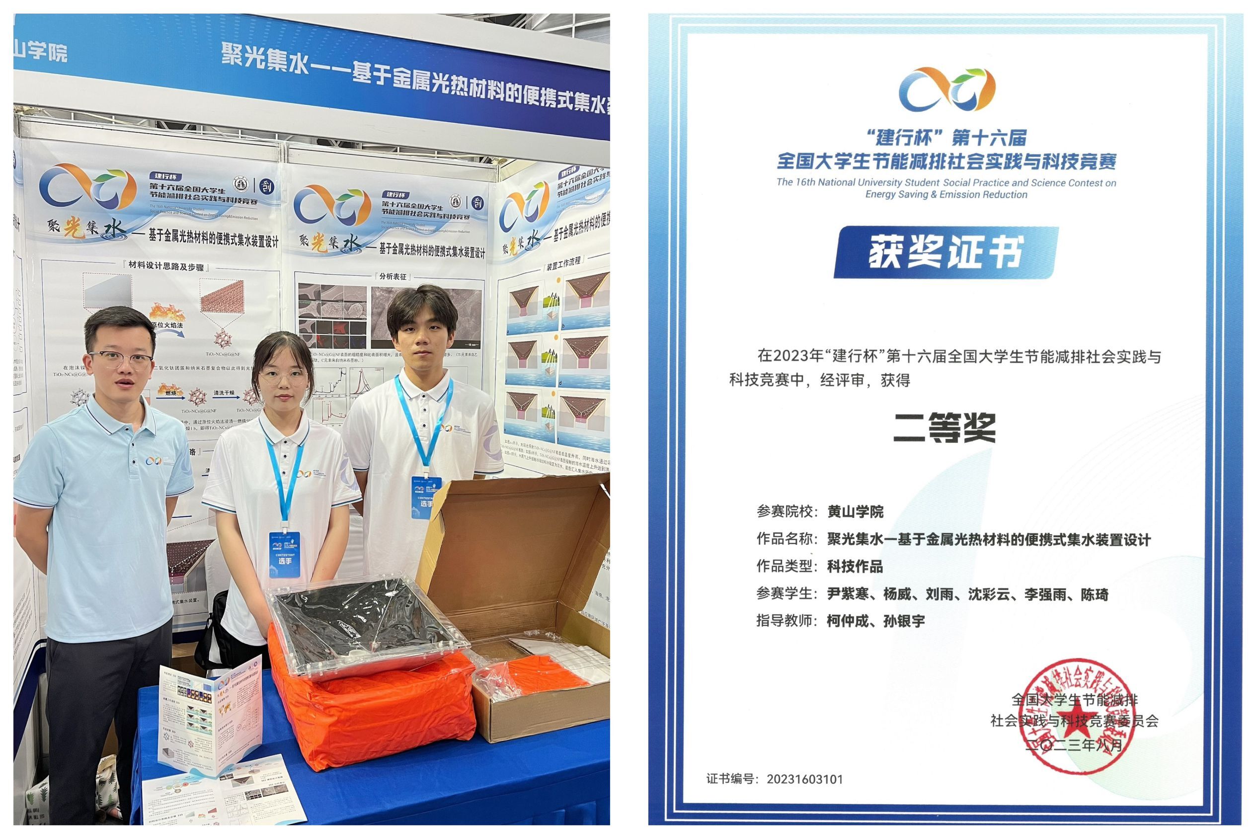 8月1日至3日,“建行杯”第十六届全国大学生节能减排社会实践与科技竞赛决赛在东南大学落下帷幕。本次大赛共有来自国内638所高校的5万余名师生参赛,提交有效作品6852件,其中,133所高校的259支队伍入围总决赛。365英国上市官方网站化学化工学院柯仲成、孙银宇老师指导,尹紫寒、杨威、刘雨、沈彩云、李强雨、陈琦6位同学的作品《聚光集水——基于金属光热材料的便携式集水装置设计》获得评审专家的好评和认可,荣获全国总决赛二等奖。这是该院首次入围该项国家级A类赛事全国总决赛并获奖,实现了历史性突破。