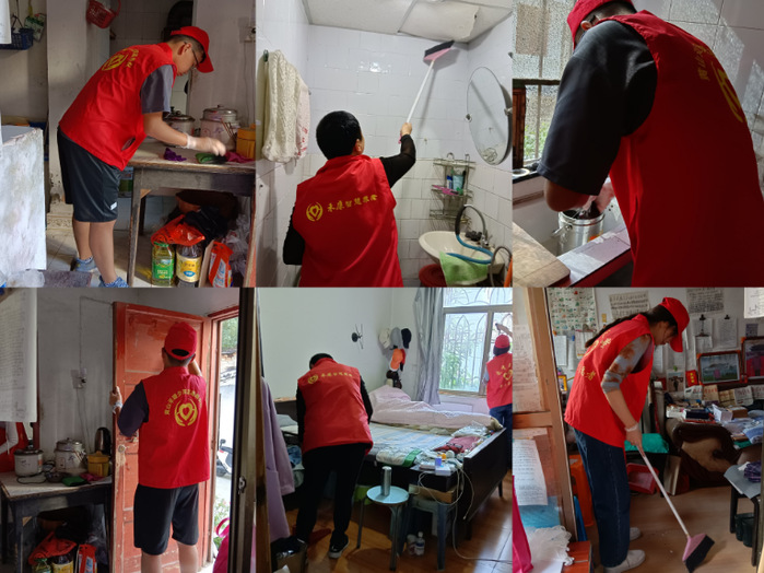 大学生志愿者和居家养老服务中心的志愿者来到水心亭社区独自居住的83岁凌爷爷家中。大家分为若干个小组,各有分工,有的拿起扫把,抹布,俯下身子,擦洗家具;有的帮忙清扫杂物垃圾;有的帮忙整理内务;有的陪凌大爷唠家常、讲讲笑话,给老人带去欢笑和快乐。大家以绵薄之力去关心老人,用热忱的心去温暖老人。