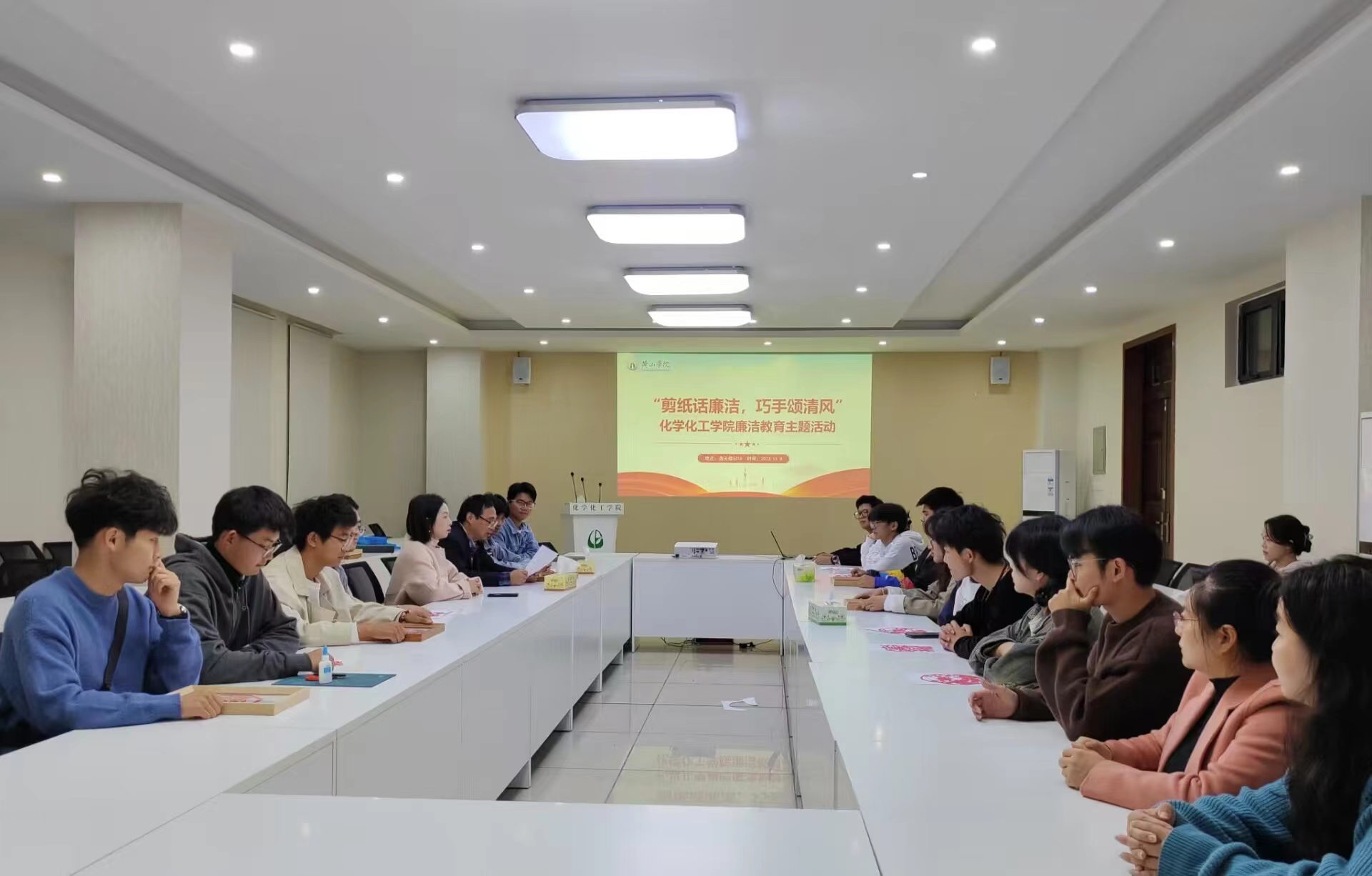 为深入学习贯彻党的二十大精神,进一步提高师生廉洁意识,涵养廉洁品格,化学化工学院于2023年11月8日在5316会议室开展“剪纸话廉洁,巧手颂清风”廉洁教育主题活动,学院党委书记叶双峰、党委副书记、纪委书记李伟伟、各党支部书记、教师代表和学生干部参加此次活动。活动由李伟伟主持。