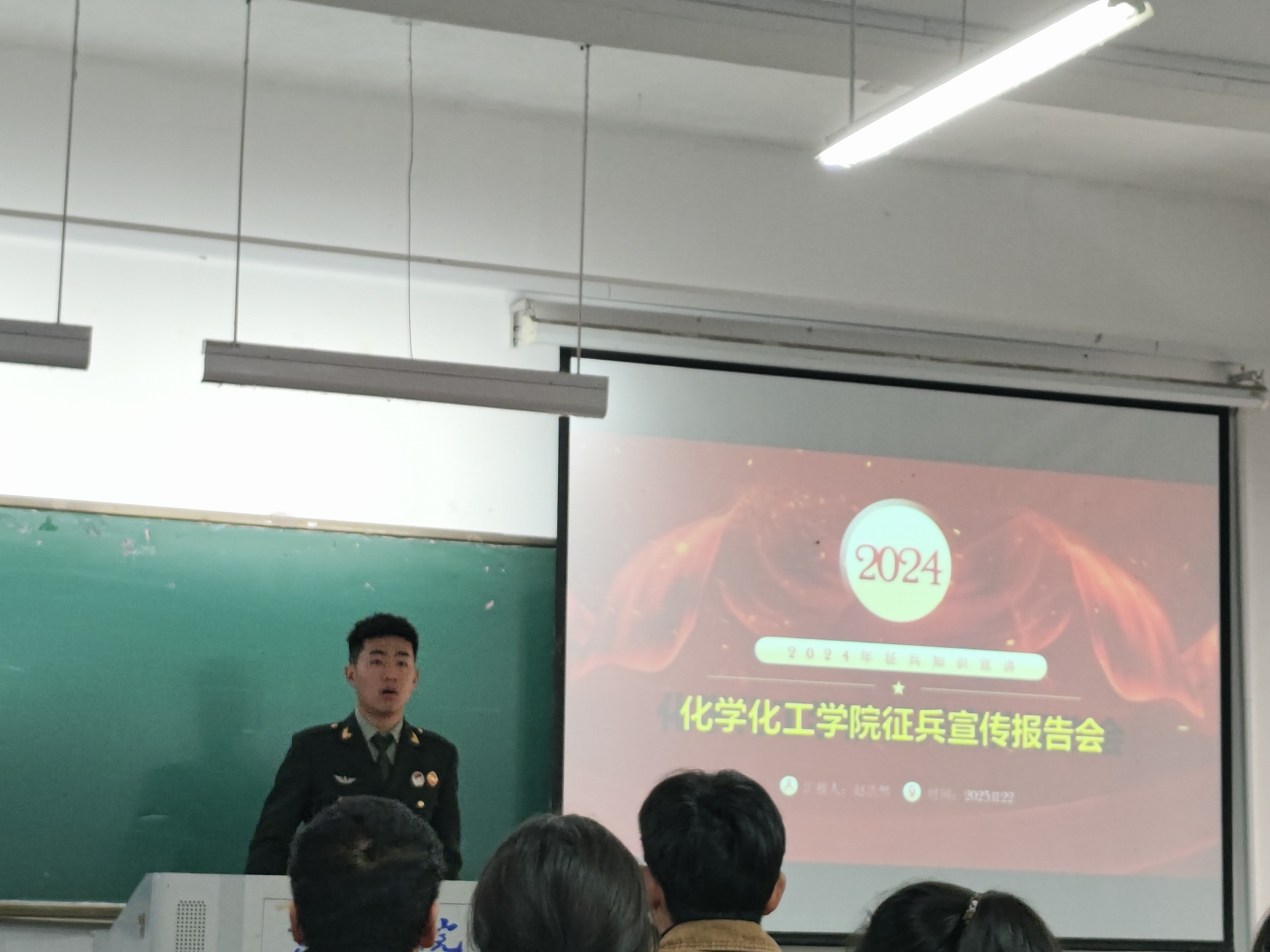 为引导广大学生投身军旅、献身国防,点燃同学们参军报国的热情和积极性。2023年11月22日,化学化工学院邀请学校征兵宣讲团在逸夫综合楼5106教室举办了征兵宣讲活动。征兵宣讲团成员和化学化工学院有意向参军入伍学生参加了本次活动。