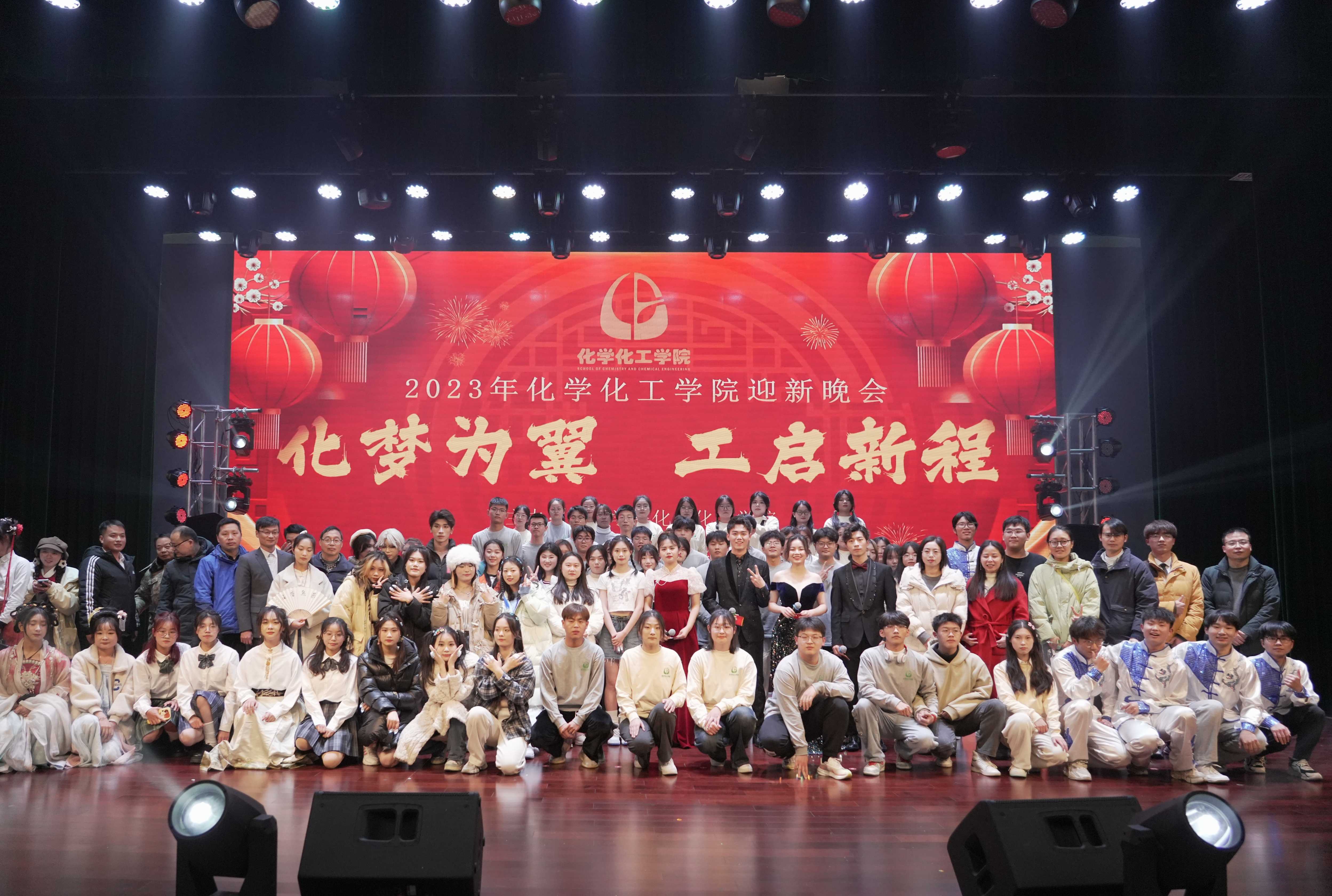 12月17日,“化梦为翼 工启新程”2023年化学化工学院迎新晚会在大学生活动中心大礼堂圆满落幕。化学化工学院领导班子全体成员、教师和近千名学生观看演出。
