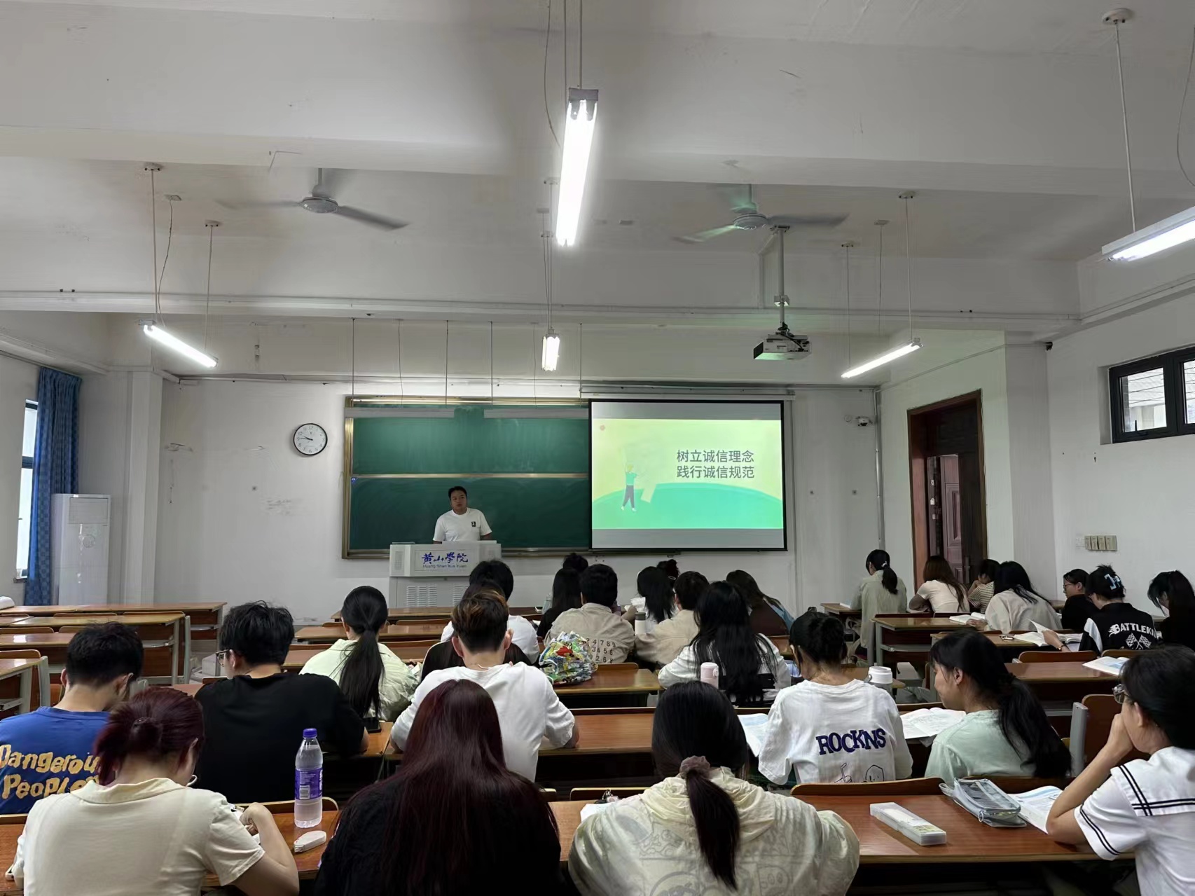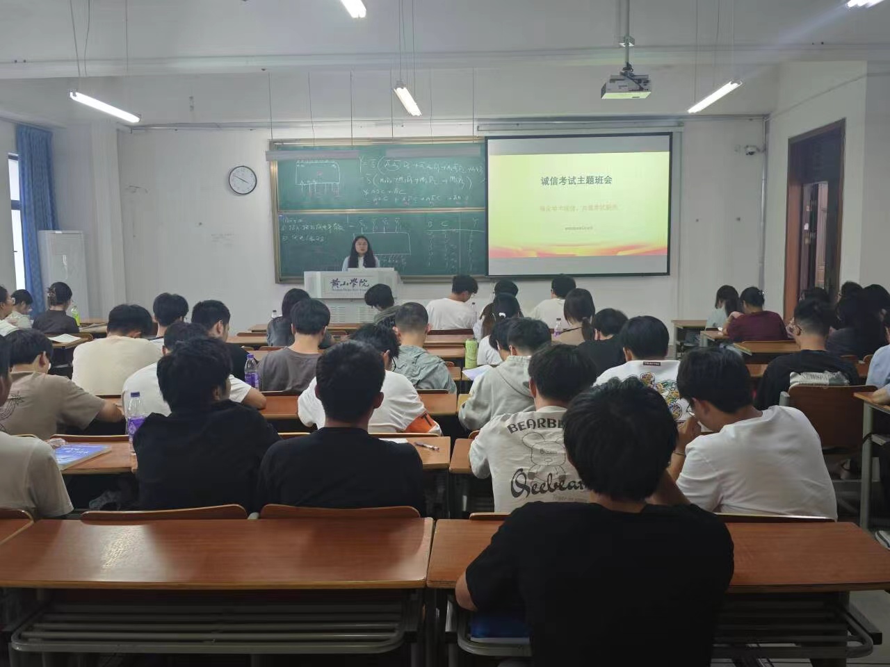 同时,班会上组织学生认真阅读考试诚信承诺书,对个人、班级、学院、学校作出承诺,践行诚信考试承诺,自觉遵守考场规定,杜绝违规违纪行为的发生。