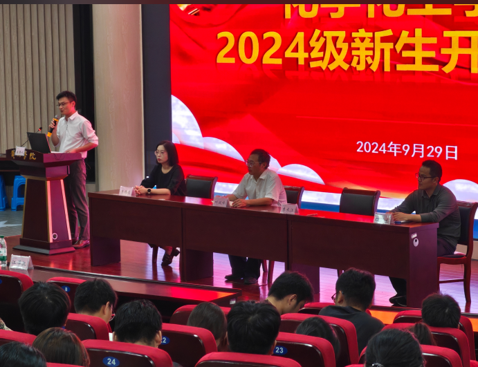 9月29日晚,化学化工学院在率水校区文端楼二楼报告厅举行2024级新生开学典礼。学院党委书记叶双峰,院长李长江,党委副书记、纪委书记李伟伟出席会议,各专业教研室、实验中心主任,新生辅导员及全体2024级新同学参加会议。会议由学院团委书记陈伟龙主持。