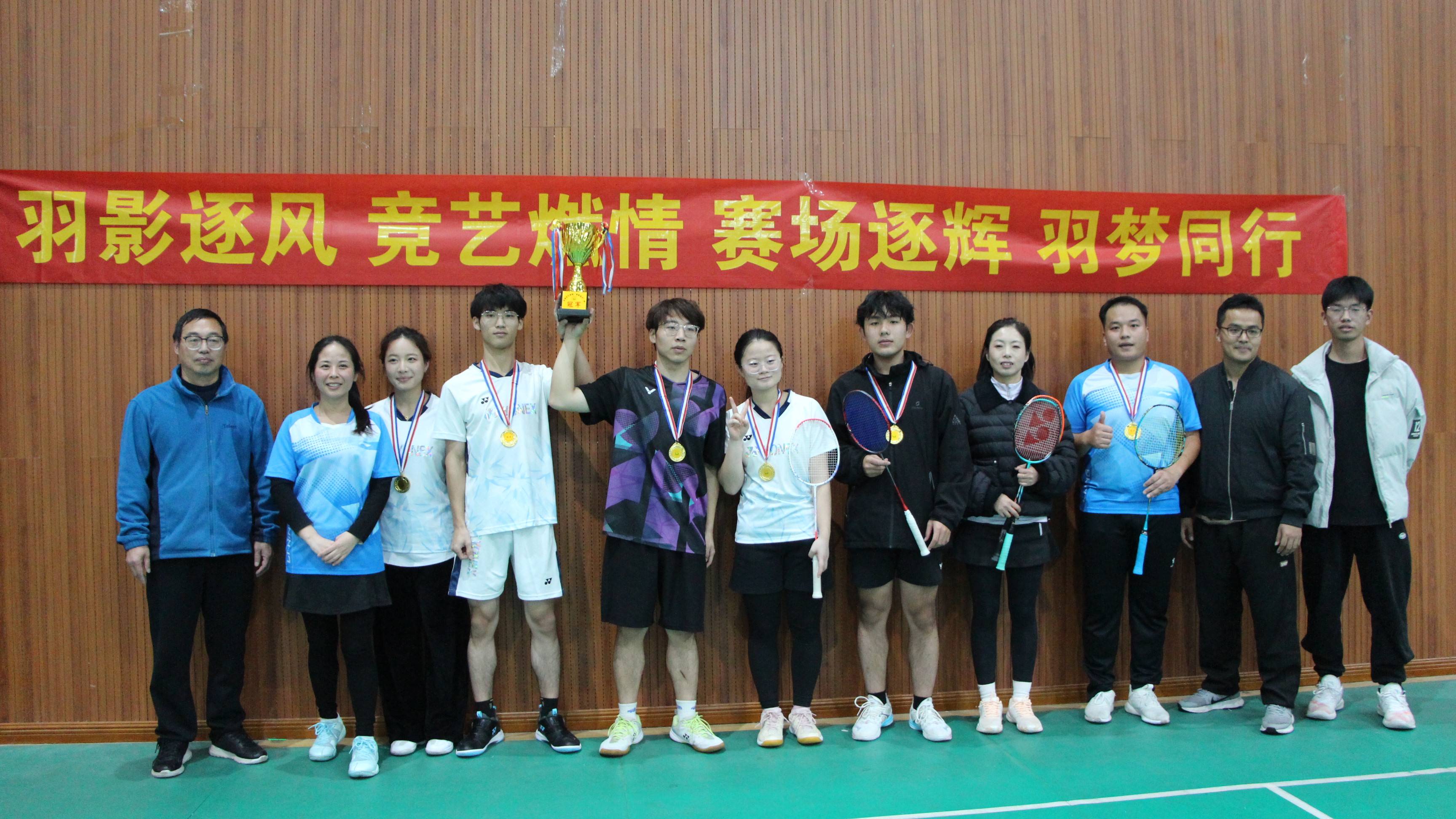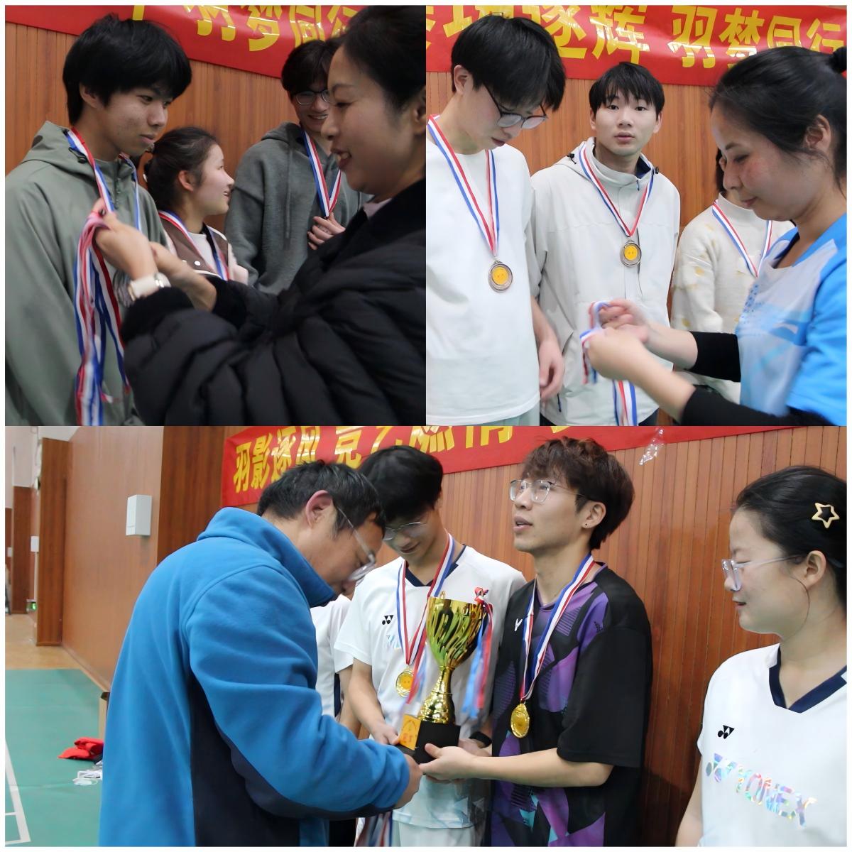 赛场上,选手们全力以赴,展现了化学化工学院学子的竞技风采。他们挥拍如风,步伐敏捷。无论是单打还是双打,选手们都展现出了高超的羽毛球技艺和默契的团队配合。比赛过程中,观众们的掌声和欢呼声此起彼伏,现场气氛热烈而紧张。比赛结束后,冠军队伍23应化班与化工院教师队伍进行了一场友谊赛,增进了师生之间的交流与友谊。化学化工学院领导对本次比赛给予了高度重视,现场为获奖班级进行了颁奖,并对所有参赛队伍表示了祝贺。