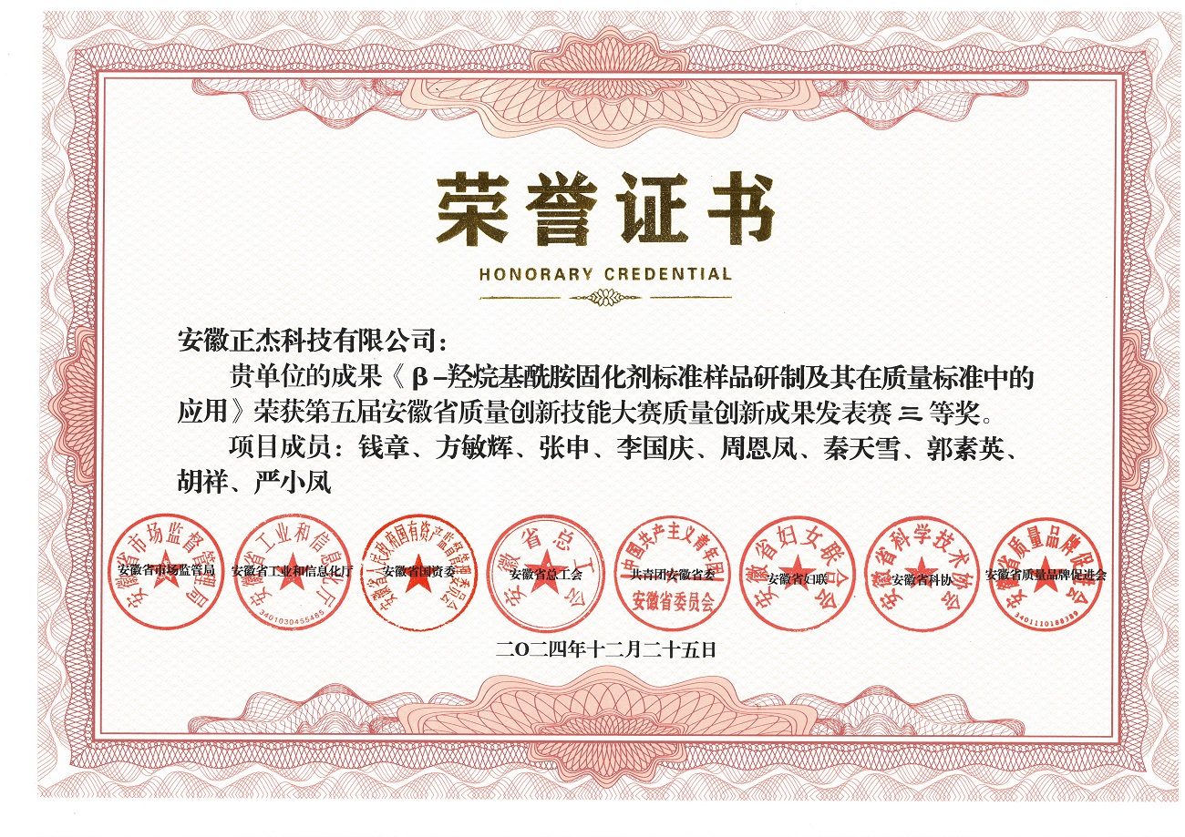 近日,由安徽省市场监督管理局等7家省直单位和安徽省质量品牌促进会联合主办,淮南市市场监督管理局等7家市直单位联合承办的第五届安徽省质量创新技能大赛在淮南市举办。本次大赛设置了QC小组、现场管理、质量创新、质量信得过班组四个类别。由我院孙光映博士(安徽正杰科技有限公司科技副总)指导,绿色化工新材料黄山市技术创新中心科研助理秦天雪、郭素英、胡祥、严小凤等同学与企业员工联合组队参赛的成果:β-羟烷基酰胺固化剂标准样品研制及其在质量标准中的应用,荣获质量创新成果发表赛三等奖,并入选《安徽省质量创新技能大赛优秀成果选集》