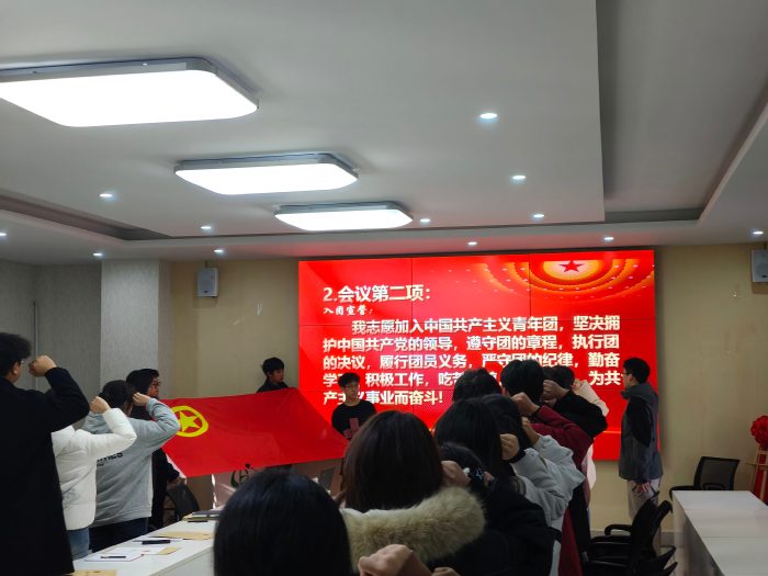 “我志愿加入中国共产主义青年团,坚决拥护中国共产党的领导……” 在新团员代表的领誓下,全体新团员高举右拳,面向团旗庄严宣誓。铿锵有力的誓言回荡在会场,表达了新团员们为共产主义事业奋斗的决心与信念。新团员代表刘然表示,将牢记入团誓言,严格遵守团的章程,履行团员义务,在青春赛道上奋力奔跑,用实际行动诠释团员的责任与担当。