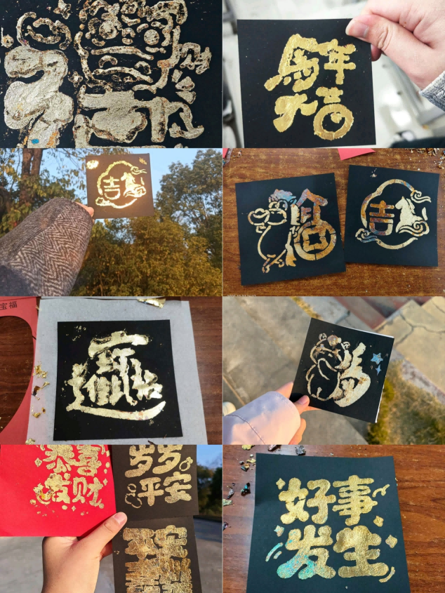 活动现场,剪纸协会、大学生书画协会、艺创手工坊的工作人员提前布置好场地,将金箔、剪刀等材料整齐摆放,营造出浓厚的传统文化氛围。体验环节中,同学们跃跃欲试,在协会成员的指导下动手创作。大家以“福”字为核心创作元素,将剪纸的镂空技法与烧箔的肌理质感相结合,小心翼翼地铺展金箔,用工具勾勒轮廓,在实践中探索金箔与纸张的融合方式。一张张普通的剪纸,在金箔的点缀与创意剪裁下,变成了独具特色的“百福”烧箔画作品。同学们纷纷表示,看似简单的烧箔与剪纸结合,实则考验耐心与巧思,亲手创作的过程,让自己真正理解了非遗手工艺的珍贵。
