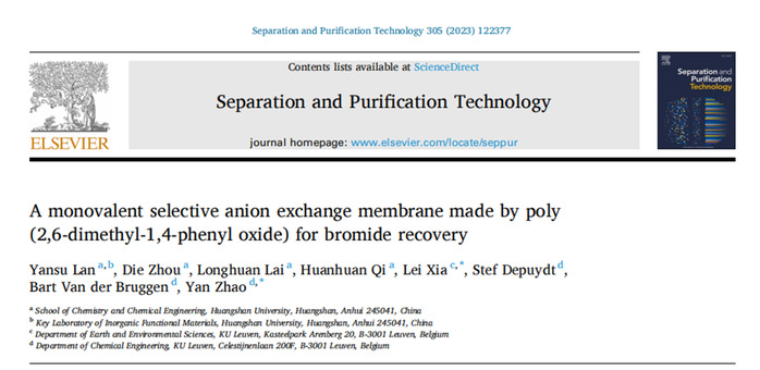 365英国上市官方网站化学化工学院兰艳素老师与比利时鲁汶大学化学工程系Bart Van der Bruggen教授课题组合作,分别在工程技术领域权威Top期刊《Desalination》(中科院1区,IF=11.211)和《Separation and Purification Technology》(中科院1区,IF=9.14)发表了题为“Alternating electric field-based ionic control and layer-by-layer assembly of anion exchange membranes for enhancing target anion selectivity”和A monovalent selective anion exchange membrane made by poly (2,6-dimethyl-1,4-phenyl oxide) for bromide recovery的科研论文。
